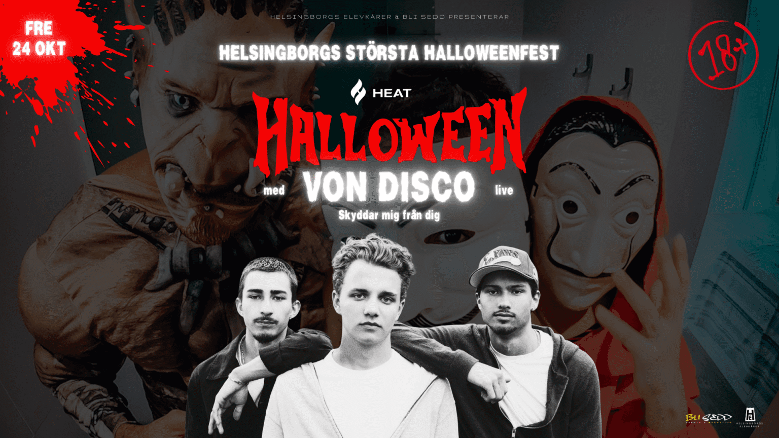 Fredag 24 oktober förvandlas Heat nattklubb till ett mörkt och magiskt inferno när årets mest efterlängtade fest tar över staden. Gör dig redo för en natt fylld av skräck, fest och galenskap med det virala succébandet Von Disco LIVE på scen! 🔥🎶